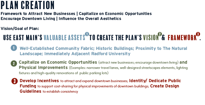 The Plan recognized the corridor’s valuable assets such as the well-established community fabric, historic buildings, proximity to the natural landscape and its immediately adjacent to Radford University. Planning policies, modification of regulations, guidelines and different types of physical improvement were suggested to work toward desired impact categories and areas. Furthermore, the Plan provided a vision and framework to attract new businesses, encourage downtown living, harness economic opportunities and influence the overall aesthetics. Examples of such improvements are well-designed streetscapes elements to encourage pedestrian use, narrower travel lanes to slow traffic, lighting fixtures, enhanced wayfinding and high-quality renovations of public parking lots. The Plan was completed in 2021.